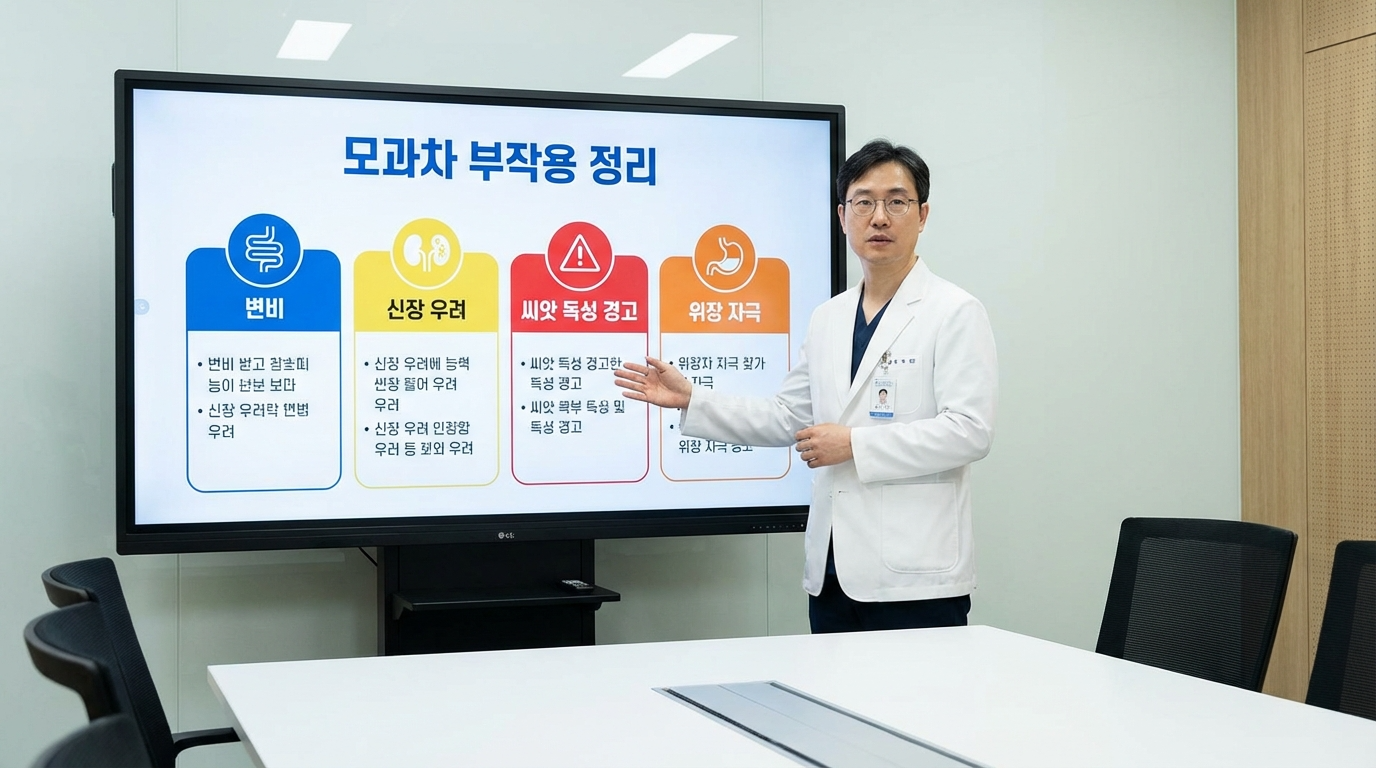 이게 가장 중요한 부작용이에요. 모과의 탄닌이 소변을 농축시키는 성질이 있어서, 신장이 약한 사람이 많이 마시면 신장에 부담을 줄 수 있어요.