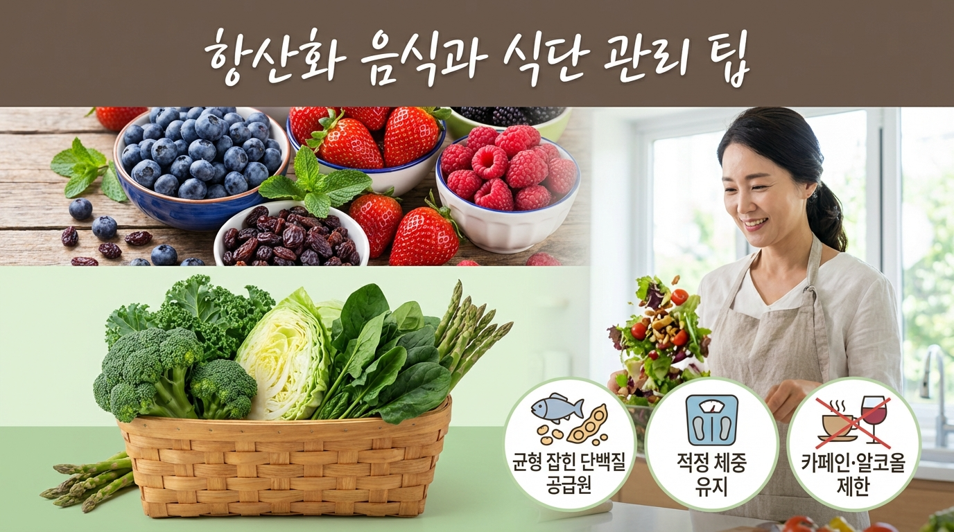 베리류는 항산화 성분의 보고예요. 특히 블루베리와 검은 건포도는 폴리페놀이 풍부해서 갱년기 증상 완화에 정말 효과적이에요. 저는 냉동 블루베리를 사다가 요거트에 섞어 먹거나 스무디에 넣어 먹어요. 신선한 딸기도 계절 과일로 자주 먹는데, 비타민 C도 풍부해서 정말 좋아요. 베리는 신선할수록 좋으니 가능하면 생과일을 선택하세요.