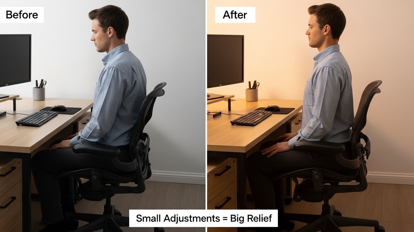 팁: 1시간마다 일어나서 몸을 펴는 것만으로도 많이 개선돼요.