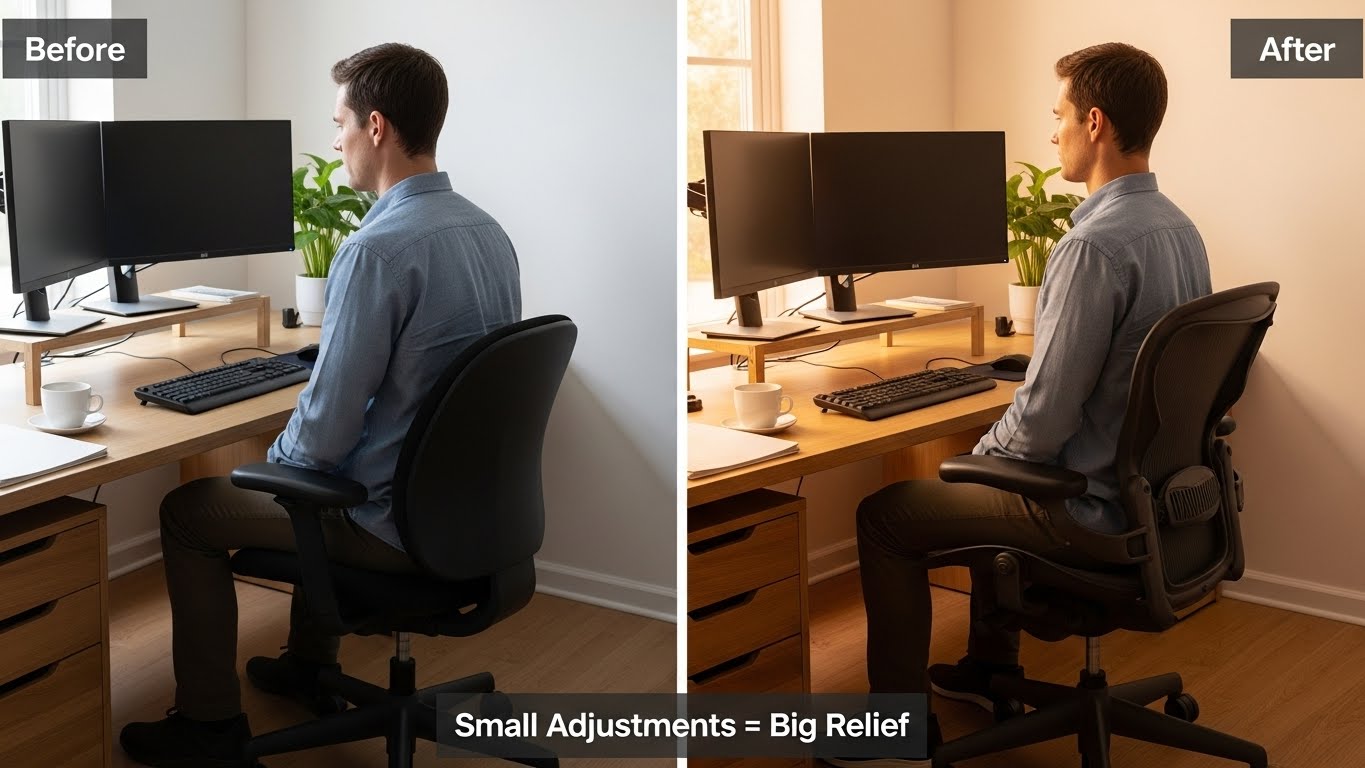 책상 높이, 의자 높이, 모니터 위치가 모두 올바른지 확인해야 해요. 의자는 무릎이 90도가 되도록 높이를 맞추고, 모니터는 눈높이보다 약간 아래에 위치하는 게 좋아요.